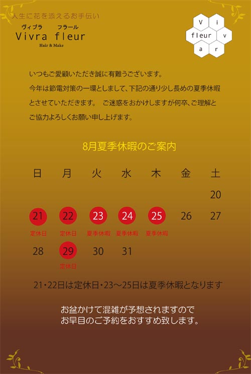 さて、今日は8月の夏季休暇をご案内します。