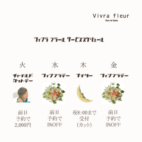Vivra fleurには大きく分けて3つの曜日ごとのサービスがあります。